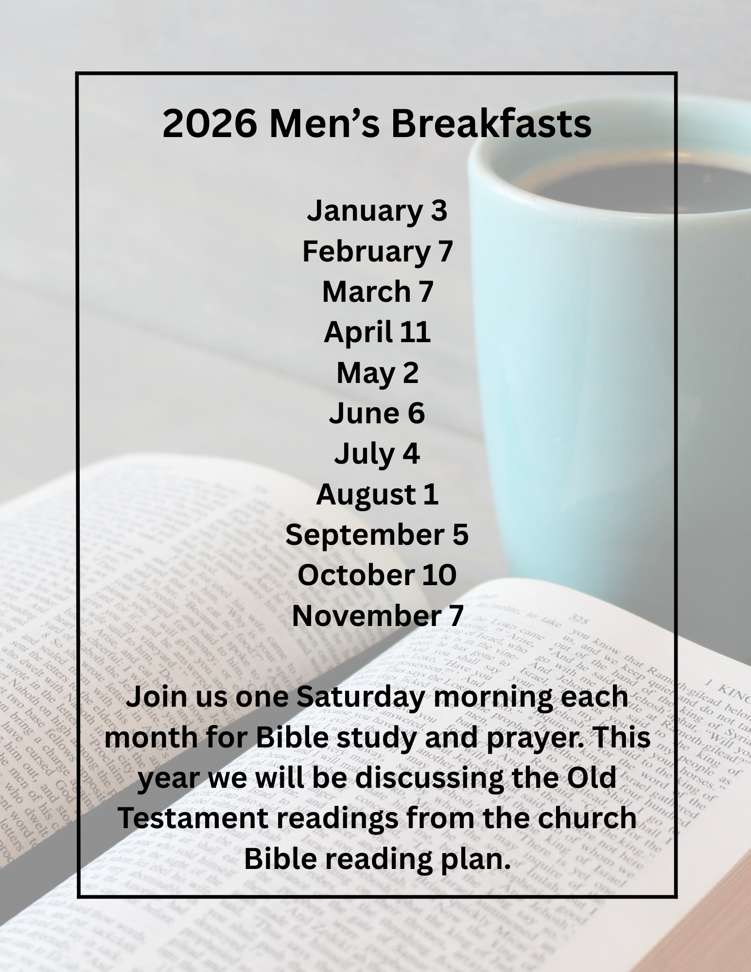 Once per month, we gather for a time of Bible study and prayer. This year our monthly breakfasts will focus on growing in our understanding of the Old Testament in coordination with our 2026 Bible Reading Plan (see tab “2026 Resources” on this website). We will also use this time to pray for each other and hold each other accountable to grow in holiness and lead ourselves, our families, and our church in godly ways. We hope you’ll join us on the following Saturdays at 8 am!